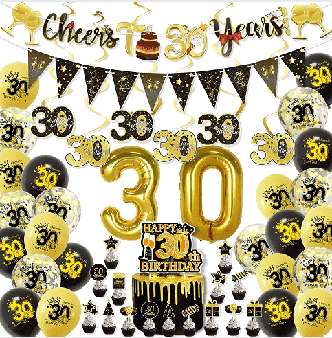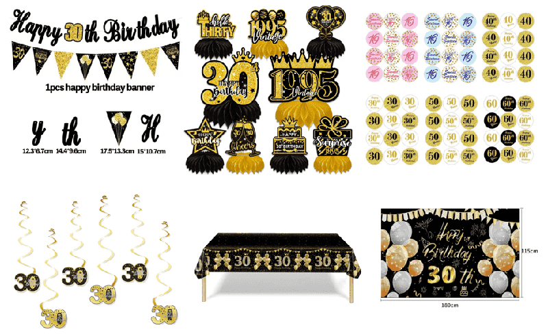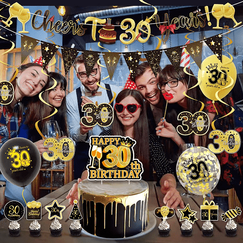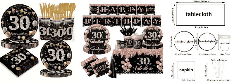 Il biglietto d'auguri di carta è il fulcro della decorazione della torta: il biglietto principale è basato su parole come "Buon 30° COMPLEANNO" ed è abbinato alla forma di una coppa di champagne. La dimensione è grande e adatta per decorare la torta principale. Ci sono anche il logo circolare "30", stelle, corone e altri cartoncini, adatti per cupcake, realizzati in cartone rigido ispessito, con bastoncini di bambù nella parte inferiore, che possono essere inseriti per l'uso.