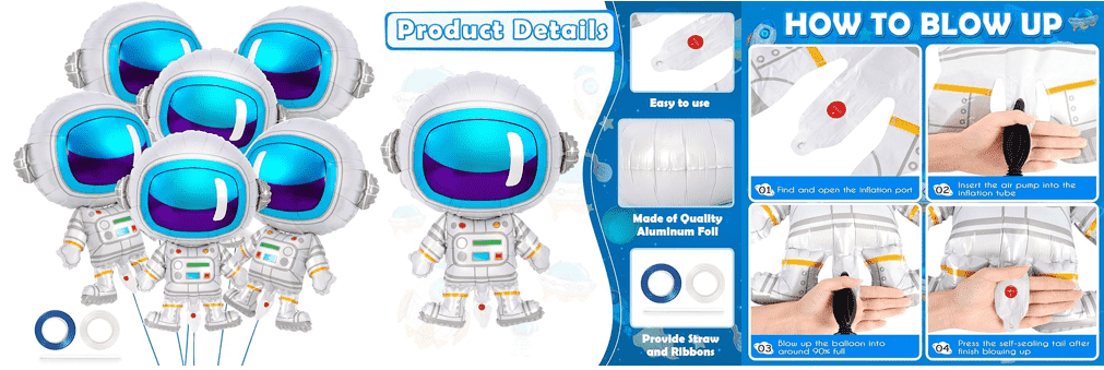 Ci sono astronauti comuni a forma di corpo intero, che mostrano l'immagine di astronauti che indossano una tuta spaziale, alcuni stili con una base, un gonfiabile può stare in piedi. Esistono varie dimensioni, come 18 pollici, 24 pollici, 28 pollici, ecc., nonché alcuni palloncini più grandi, come i palloncini foil per astronauti in piedi con un'altezza di 65 cm. Viene utilizzato principalmente per feste di compleanno a tema spaziale, feste di benvenuto per bambini, decorazioni per la stanza dei bambini e altre occasioni, che possono aggiungere un'atmosfera gioiosa e spaziale all'evento.