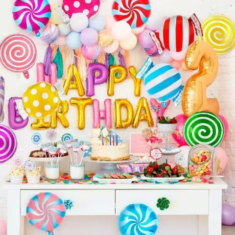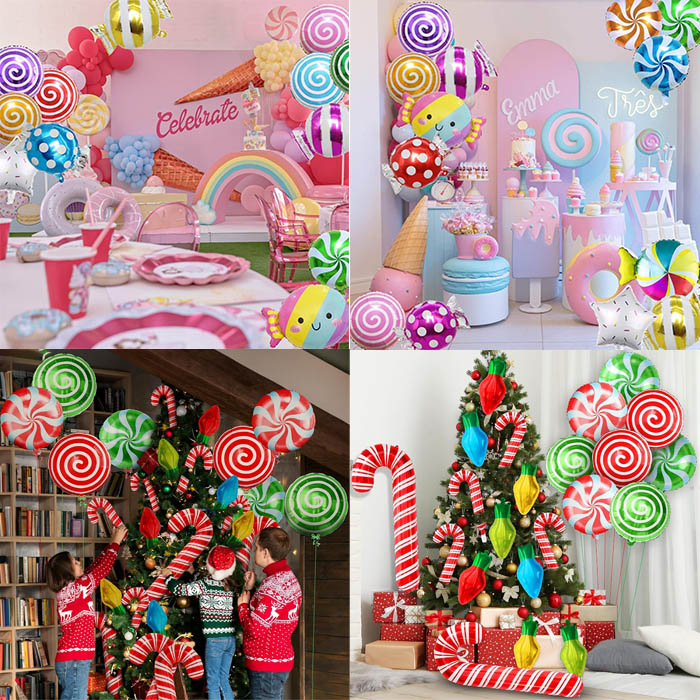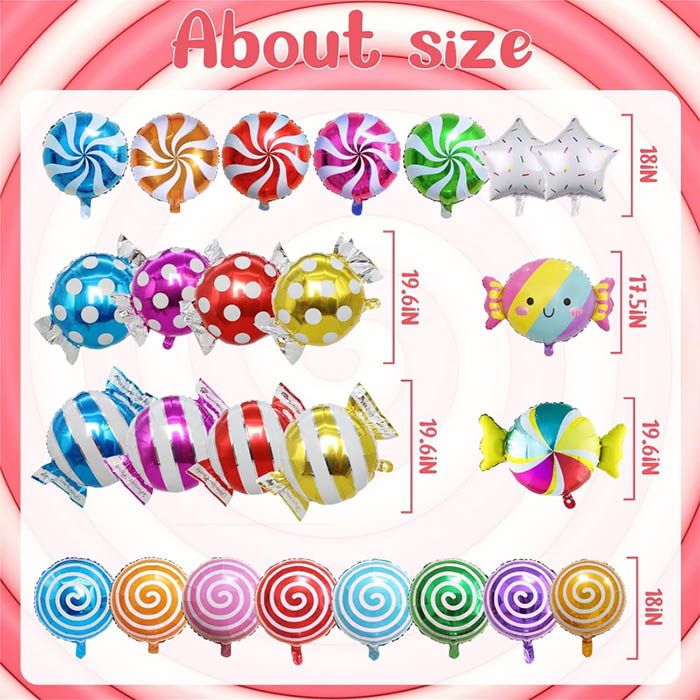I palloncini di fogli di caramelle sono attualmente disponibili in una varietà di colori e stili, creando una nuova decorazione per feste a tema caramelle per adulti, bambini, ragazzi, ragazze e persone di tutte le età. Ballioni a tema a tema caramelle di Natale luminoso e colorato, un abito a palloncino a tema a tema Lollipop carino è un'aggiunta carina alla decorazione a tema di compleanno a tema. Il palloncino per fogli di caramelle si abbina perfettamente ad altre decorazioni per feste di caramelle, facendo un bellissimo regalo, uno sfondo e oggetti di scena fotografici per gli amici a cui piacciono i lecca -lecca.