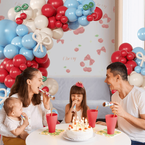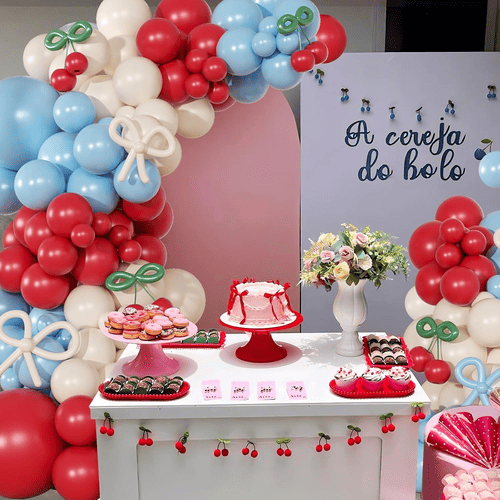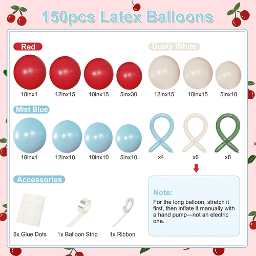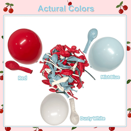 L'arco per palloncini con fiori di ciliegio viene fornito con vari palloncini in lattice, tra cui un palloncino in lattice rotondo e un palloncino in lattice lungo. Lo stile complessivo del kit è positivo e carino, è stato amato dai clienti di tutto il mondo. I colori del palloncino rotondo in lattice sono rosso, bianco polveroso e blu nebbia. E per i palloncini in lattice lunghi è blu nebbia, bianco polveroso e verde, i palloncini in lattice lunghi sono usati per realizzare lo stile papillon e lo stile ciliegia.