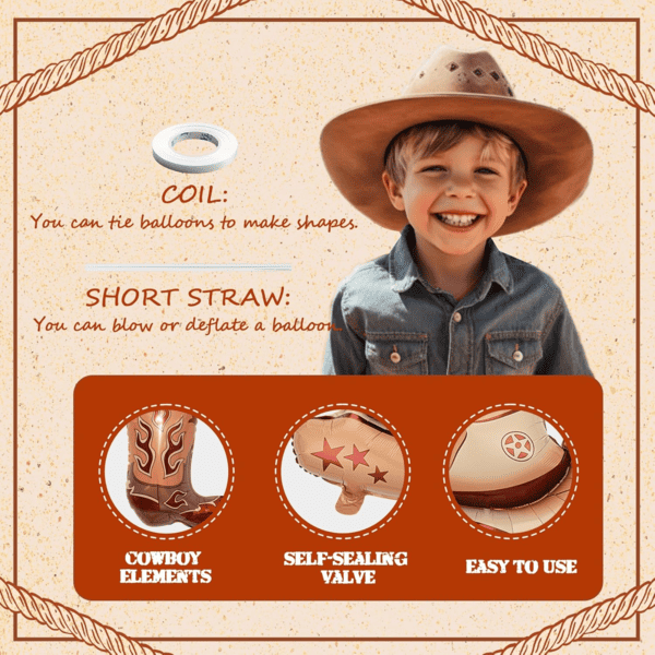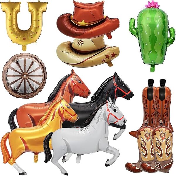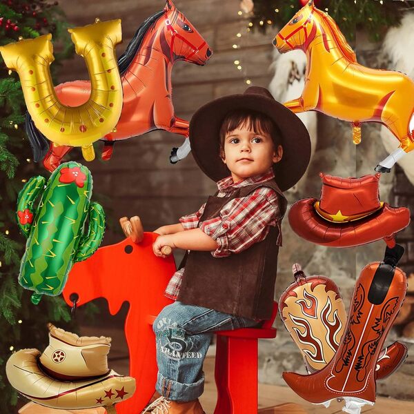 Palloncini foil cowboy con elio:Riempi i palloncini in foil da cowboy e i relativi palloncini in lattice con elio, manterranno l'effetto fluttuante. Sia collocato nel negozio che esposto per strada, può attirare l'attenzione di tutti. I bellissimi palloncini foil a forma di cavallo, i palloncini foil con cappello da cowboy a tesa larga e i palloncini foil con stivale da cowboy che bruciano di fiamme: sono tutti semplicemente irresistibili.