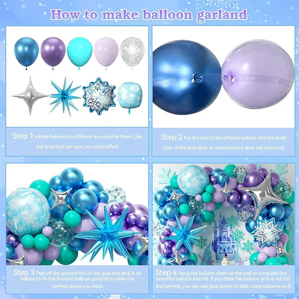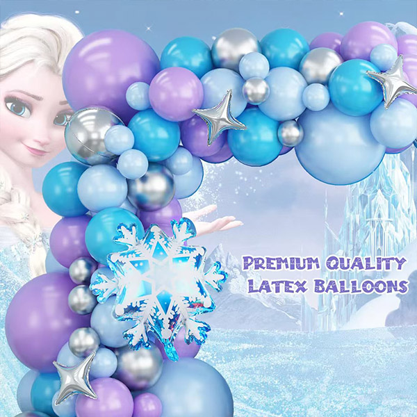 Oltre ai normali palloncini, il kit include molti elementi a tema. Ci sono grandi palloncini in fogli di fiocchi di neve. Hanno trame delicate. Sono proprio come i magici fiocchi di neve creati da Elsa nel film. Puoi usarli per costruire un arco. Puoi anche usarli per decorare una parete di sfondo. Questi colori si fondono insieme. Creano immediatamente un'atmosfera come essere in un regno di ghiaccio e neve.