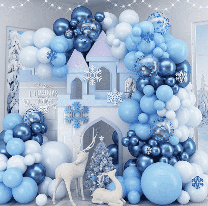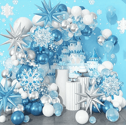 3.Kit ghirlande di palloncini Frozendi solito contengono varie dimensioni dipalloncini congelati, palloncini in alluminio unici, nastri decorativi coordinati, gonfiatori, punti di colla non contrassegnati, fascette di installazione e altri accessori per soddisfare i requisiti di layout in un'unica soluzione. Tutti i componenti sono realizzati con materiali sicuri ed ecologici, completamente adattati alle scene di attività dei bambini. Il motivo a palloncini della tuta è accuratamente abbinato, combinando l'immagine classica del personaggio di Frozen con gli elementi da sogno di ghiaccio e neve. I colori sono il blu, il bianco e l'argento, creando un'atmosfera magica, pura e romantica.