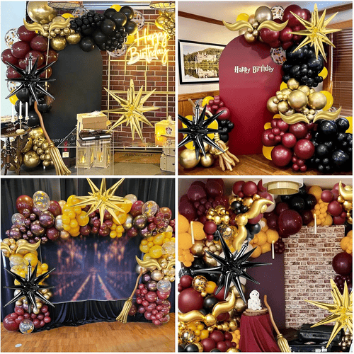 Il palloncino in lattice nell'arco per palloncini a tema Harry Potter è realizzato al 100% in lattice grezzo importato dal sud-est asiatico. Poiché sono materiali naturali, sono totalmente ecologici e innocui per bambini e adulti. I loro colori sono colori simbolici dei film di Harry Potter, tra cui il rosso vino, il giallo, il nero e l'oro. Per aggiungere più strati, abbiamo aggiunto anche il palloncino di coriandoli, i coriandoli sono color oro metallizzato.