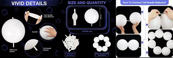 Che si tratti di una festa di compleanno, del matrimonio, della celebrazione o di qualsiasi altra occasione, abbinando i palloncini dello stesso colore o di altri colori, puoi creare l'elegante atmosfera che desideri. Saranno gli abbellimenti perfetti per anniversari, Halloween, feste di benvenuto, feste natalizie o qualsiasi altro evento. I palloncini di collegamento sono tutte scelte ideali per creare un'atmosfera unica e attirare l'attenzione.