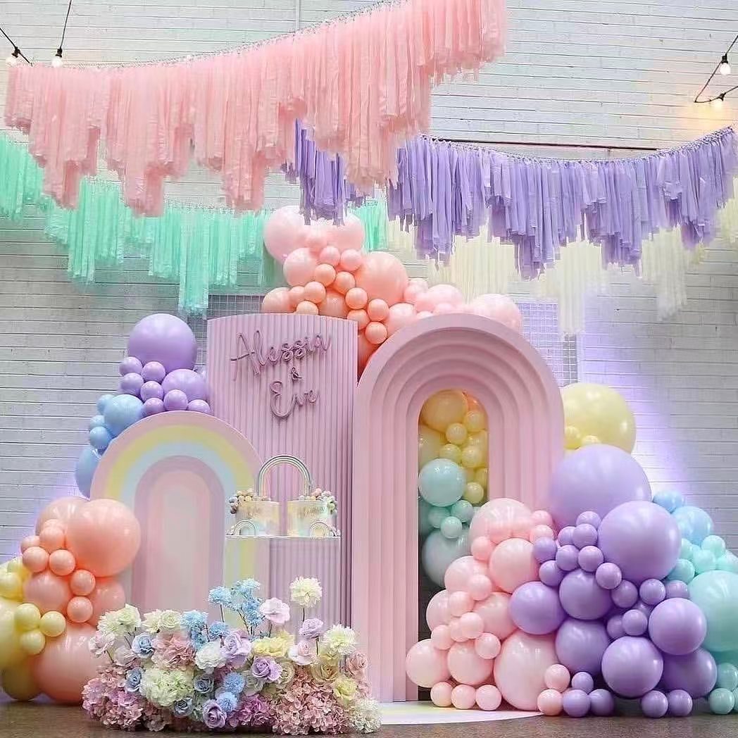 I palloncini macaroon arco di ghirlande non danno un impatto visivo troppo forte. Sembrano ancora eleganti e attraenti. Funzionano bene come uno sfondo fotografico e possono aiutare a migliorare l'immagine del marchio e l'esperienza del cliente.