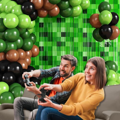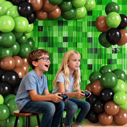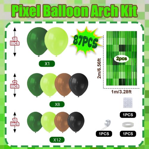 Ispirato ai videogiochi Minecraft, questo resistente kit arco per palloncini Minecraft combina varie tonalità di palloncini pixel verdi con fondali per feste a tema Minecraft per creare un giocoso look a strati che cattura il fascino dei classici giochi di avventura.