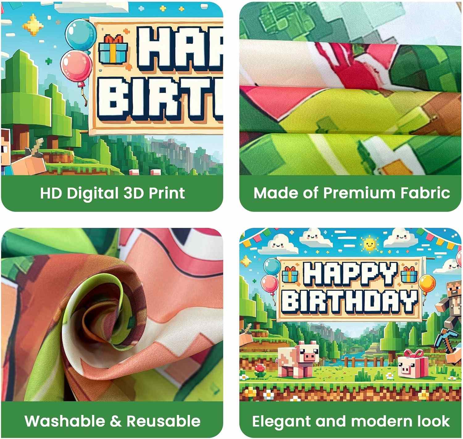 La tovaglia di Minecraft ha molti stili. Alcuni stili copiano l'aspetto pixel di erba e sporcizia dal gioco. La cima del tavolo sembra una terra di piccoli blocchi. Alcuni stili si mescolano a ruoli. Alcuni stili mostrano TNT o una spada di diamanti. Queste parti rendono forte il tema della festa. La dimensione si adatta a molti tavoli. La cima del tavolo può essere coperta per intero. Dà spazio per mostrare cibo. Dà spazio per mostrare regali.