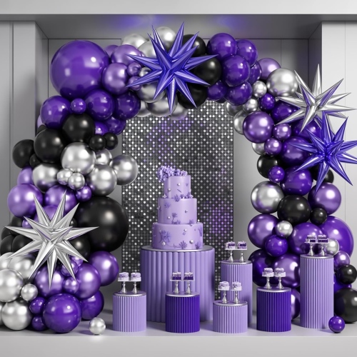 I set di ghirlande di palloncini viola e neri sono uno degli stili più popolari nei nostri kit di ghirlande di palloncini. La ghirlanda ad arco di palloncini includePalloncini viola opaco da 5 pollici, 10 pollici e 18 pollici, palloncini neri opachi da 5 pollici, 10 pollici e 18 pollici,Palloncini argento metallizzato da 10 pollici, palloncini coriandoli argento da 12 pollici e accessori per palloncini che incollano punti, catena di palloncini, nastro e così via.