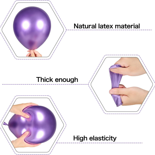 La quantità e il peso dei nostri kit ghirlande di palloncini viola e neri sono superiori a quelli di altri marchi. Ciascuno dei nostri kit di archi con ghirlande di palloncini contiene almeno 100 palloncini. Ogni dimensione di palloncino che offriamo utilizza il peso in grammi standard del settore. Ad esempio, il peso in grammi dei palloncini da 12 pollici è 2,8 g. Possiamo anche regolare il peso in grammi del palloncino se hai requisiti speciali. Come puoi vedere dalle immagini qui sotto, è sufficiente uno solo dei nostri set di palloncini per creare facilmente una scena di festa elegante e suggestiva.